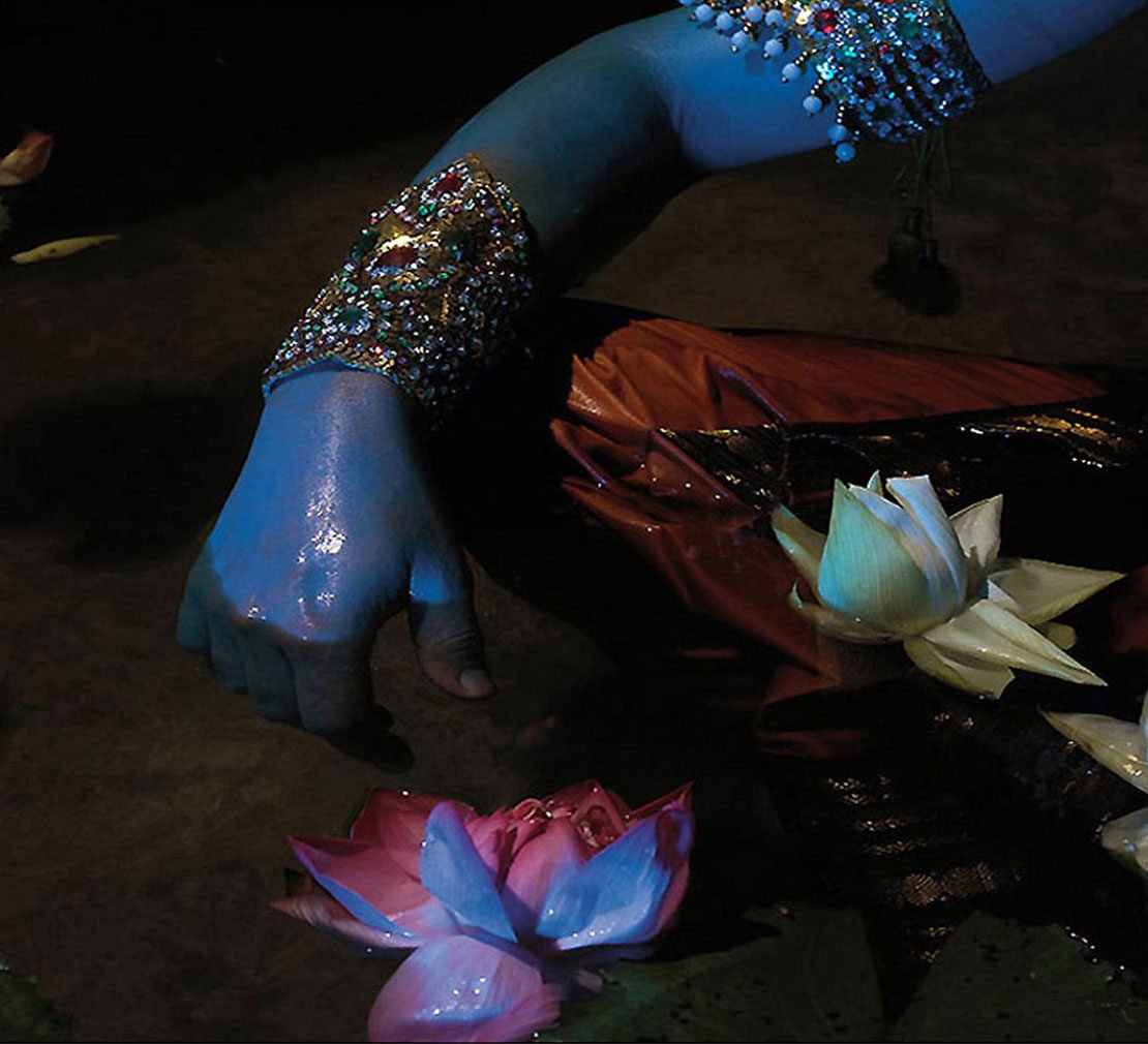 Nandini Valli Muthiah graduated with a B.A. in Photography in 2005 from the Arts Institute at Bournemouth, UK. Her first major suite, The Definitive Reincarnate, delves into the concept of incarnated divinity through the vessel of Vishnu. The photographs are highly stylized, with rich colors and tightly choreographed settings that draw from the kitsch calendar art representation of Hindu deities, evoking dramatic fashion magazine portraits of celebrities. According to the artist, the idea behind The Definitive Reincarnate was to "take Vishnu and sort of update him." In this series, Vishnu is depicted with a full spectrum of human emotions, captured in highly-charged exposures that possess a painterly quality.