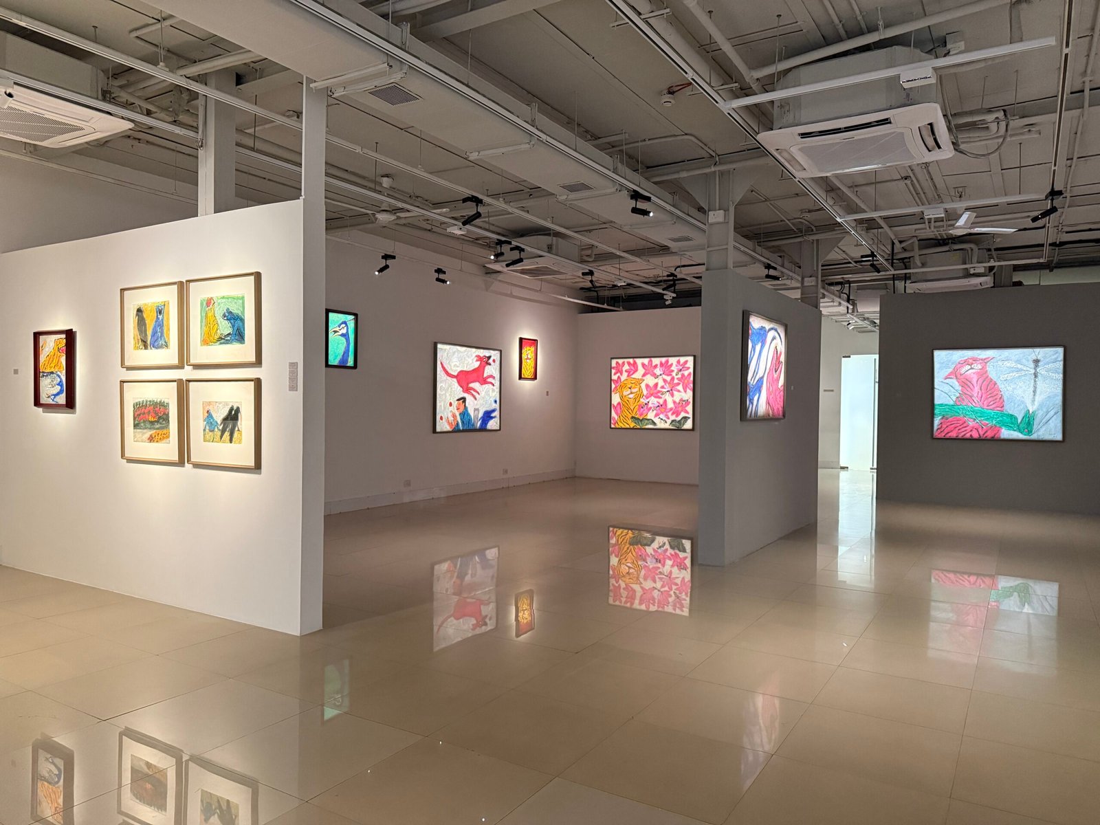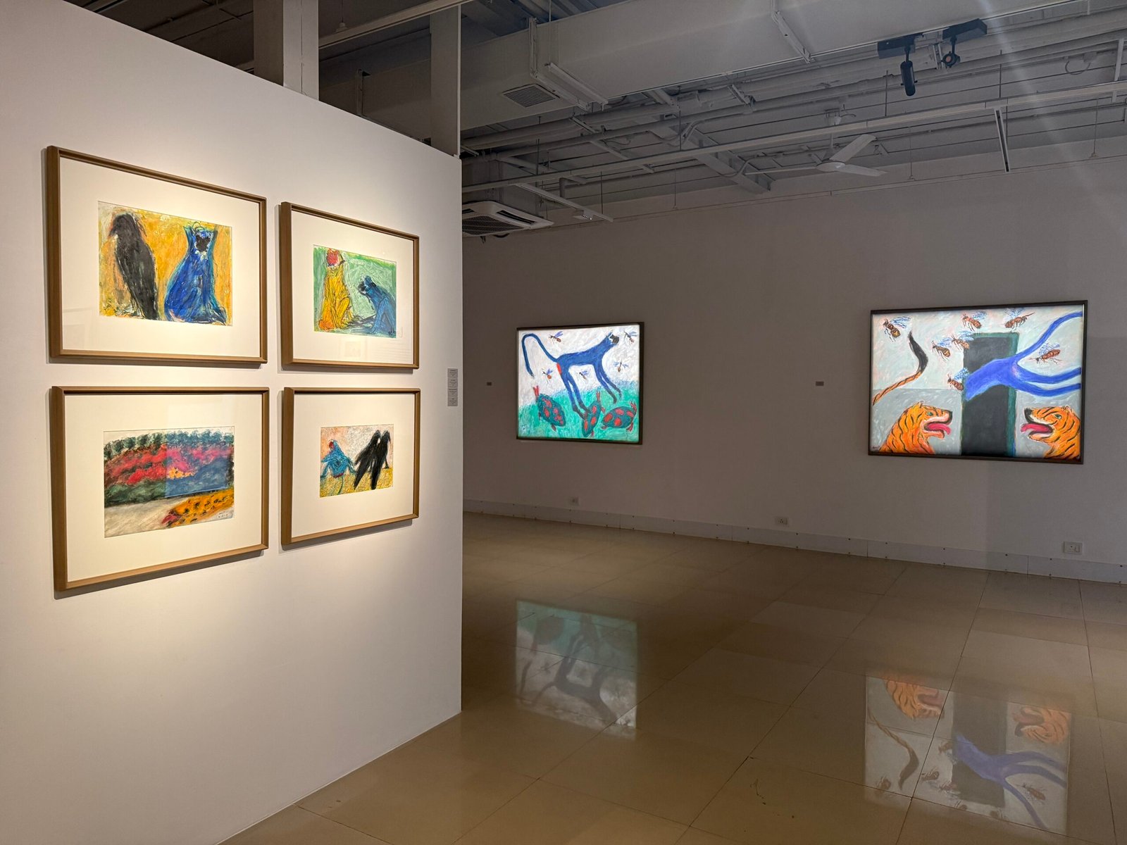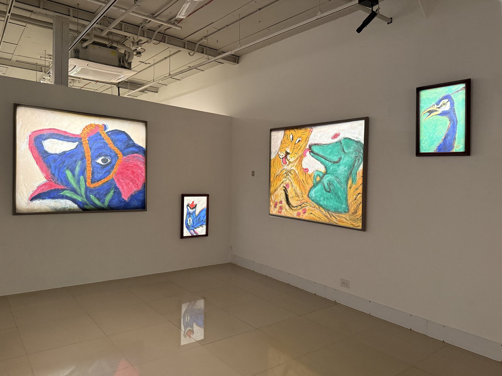In 'Leela', Amit Ambalal explores the idea of cosmic play shaped by childhood myths and a sustained engagement with Nathdwara and pichwai traditions. His paintings move beyond a human-centred gaze, where animals, birds and trees exist in gentle synchrony within a shared, unfolding world. Colour carries devotional meaning blue for Krishna, yellow for Radha and green as their union, making the palette symbolic as well as visual.