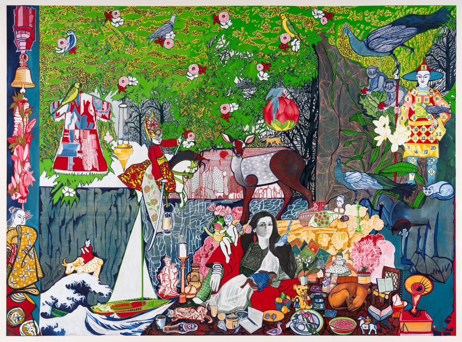 Rekha Rodwittiya | Home is Wherever You Are | 2025 | Hand painted watercolour over digital print of autobiographic imagery | 57 x 77 InchesRekha Rodwittiya
